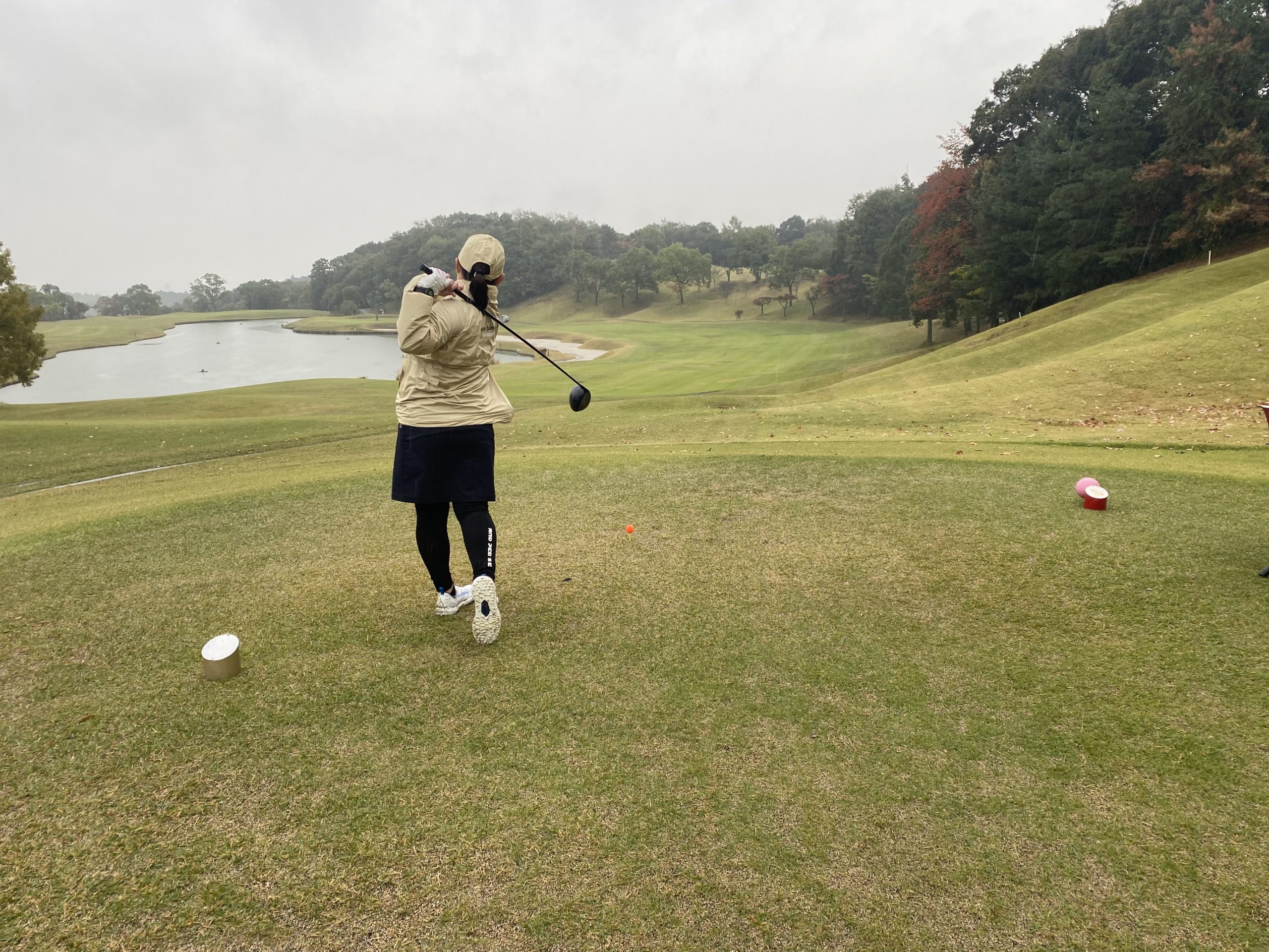 - 番手はワンクラブ大きめに: 雨の日はキャリーが出ません。少し大きなクラブで、ゆったり振るのが正解です。